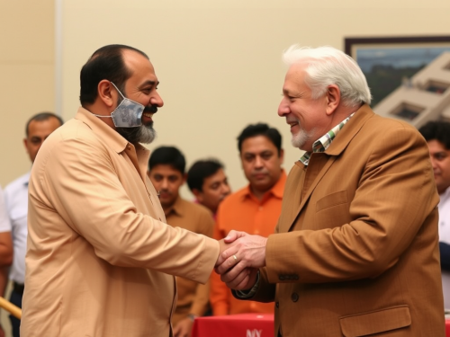 create a beautiful event venue with 2 middle aged men shaking hands smiling who are board members for a fortune 500 company. The event should exude luxury and use the color codes #2E3851 and #A66740. The image should be photo realistic and HD with real humans