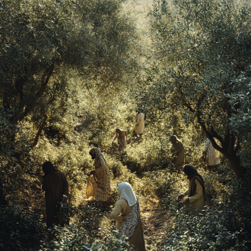 A panoramic view of lush olive groves in northern Iran,in Style of v magazin photo with sunlight filtering through the leaves, casting soft shadows on the ground. Local farmers, dressed in modern yet traditional clothing, are harvesting olives. The atmosphere is vibrant and serene, capturing the essence of a healthy, natural environment. The scene emphasizes the beauty of the landscape and the care taken in olive cultivation.