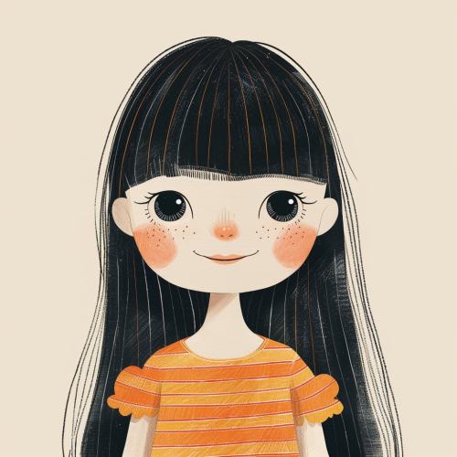 A cute girl with big eyes, long black hair, and bangs, smiling slightly. She is wearing an orange striped dress with yellow stripes on the sleeves. The illustration style should be vintage and simple, reminiscent of mid-century children's book illustrations. Use soft pastel colors to give it a gentle feel. Her head size must not cover more than one-third of the frame. There is no background or scenery in front of her, just plain white paper.--ar 9:16 --v 6.0