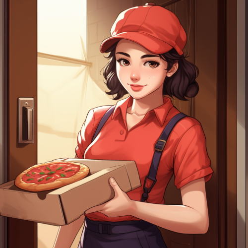 an american pizza delivery girl, standing in a doorway with pizza boxes in her hands and a small smile on her face. Anime style.
