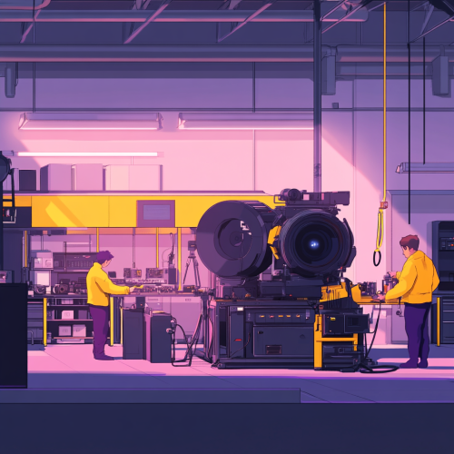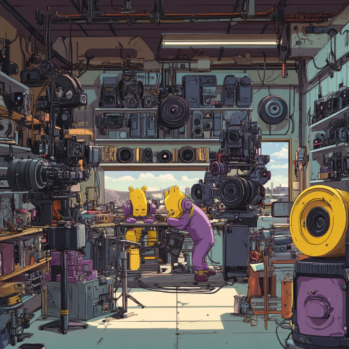 Anime-inspired mechanic shop with a limited color palette of six main colors, featuring yellow and purple-skinned mechanics working on oversized cinema cameras and video equipment. The shop has a racing garage feel, with cinema cameras on car lifts, tripods replacing engine hoists, and shelves filled with lenses and film reels as if they were spare parts. The mechanics are lively and detailed.