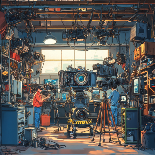 A vibrant, anime-inspired mechanic shop transformed into a video production garage. The scene is filled with oversized cinema cameras on car lifts, sleek tripods replacing engine hoists, and shelves lined with lenses, film reels, and coiled cables like high-performance parts. Mechanics in rugged yet stylish workwear make precise adjustments to camera gears, surrounded by detailed, colorful toolkits. Neon accents and warm lighting create a cinematic glow, with sunlight pouring through large, gridded windows. The aesthetic combines the high-energy vibe of a racing garage with intricate anime detailing, blending mechanics and film equipment in a unique, action-packed workspace.