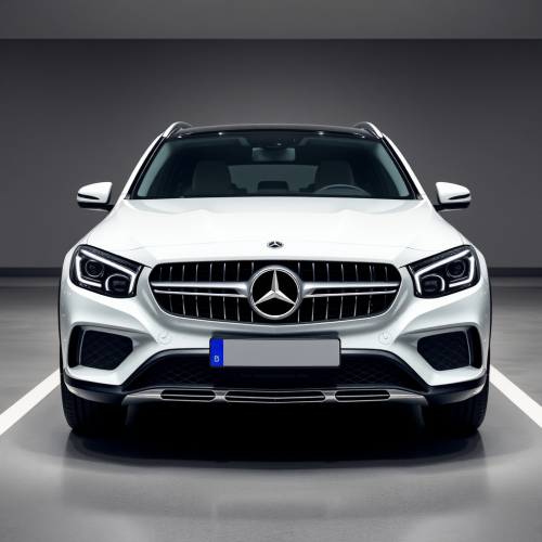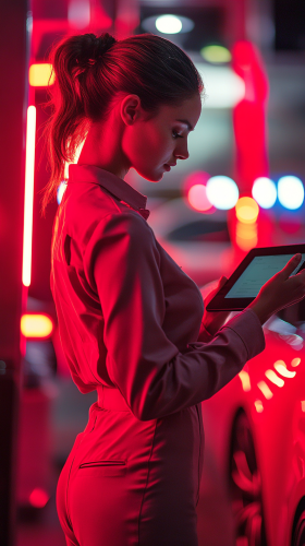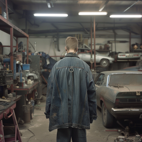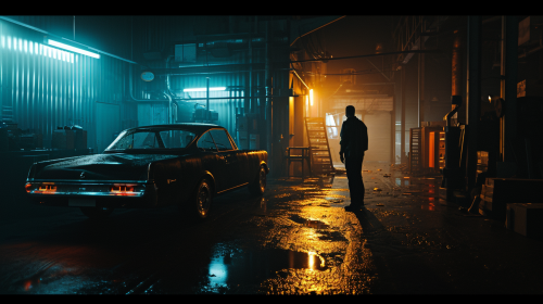 Exterior of a car warehouse. Medium shot, full body. Shot on a Nikon F5, Ilford Delta 3200 film. The setting should be black backdrop with cinematic lighting. Use the Midjourney v5 with photorealism mode turned on to capture the minimal details of inside of a warehouse.