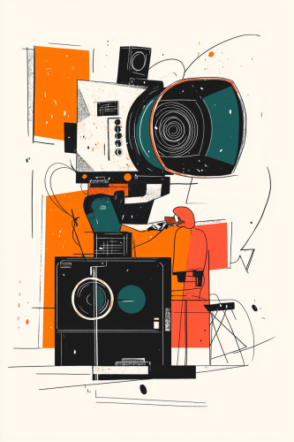 Minimalist illustration of a mechanic working on an old-school cinema camera, inspired by Lev Shepelev’s style but with a playful twist. The character is depicted with flowing black pen lines and large, bold color blocks, creating a simple yet expressive composition. Limited use of lines with emphasis on form, capturing a vintage, stylized look. The background is minimal, letting the character and camera stand out, using muted tones with pops of color to evoke a light, artistic feel --ar 2:3