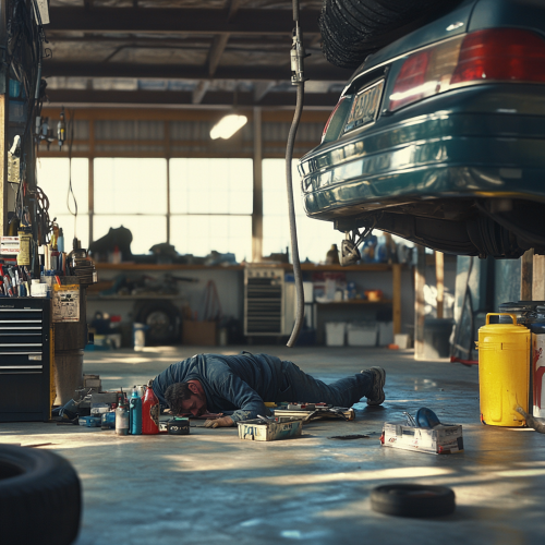 A busy, well-used garage where a mechanic is lying on a creeper under a car, fixing its underside. The garage floor is concrete, slightly stained with oil and grease from years of use. Scattered around are various tools like wrenches, sockets, and screwdrivers, with an open toolbox nearby, showing the mechanic’s active work area. Several bottles of motor oil and cleaning chemicals are placed against the wall, along with a stack of tires and spare parts in the background. The lighting is natural, coming from large overhead windows, casting shadows across the floor, creating a gritty yet functional atmosphere. In the corner, a hydraulic jack is lifting part of the car, and a shop rag hangs from the side of the toolbox. The overall vibe is that of a professional, hard-working garage, with the focus on the hands-on mechanic work and well-used equipment. --v 6.1