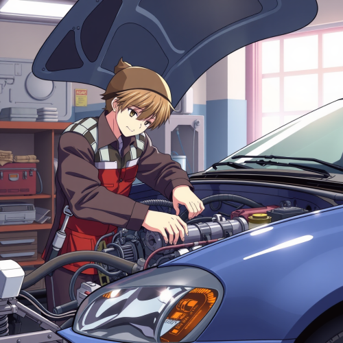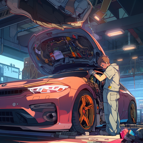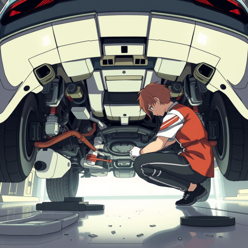 anime mechanic repairing the bottom of a futuristic car --niji 5