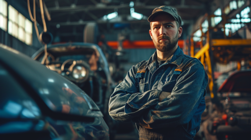wide portrait of female car mechanic dressed in agent provocateur in a black and orange car in a chaotic vintage cars workshop , beautiful smiling supermodel , confident relaxed, stylish décolletage, curvaceous, lips, teeth. Soft-lighting, 32k-resolution, sharp-focus, ultra-detailed, UHD. --chaos 30 --ar 16:9 --weird 0 --iw 0.4 --v 5.2