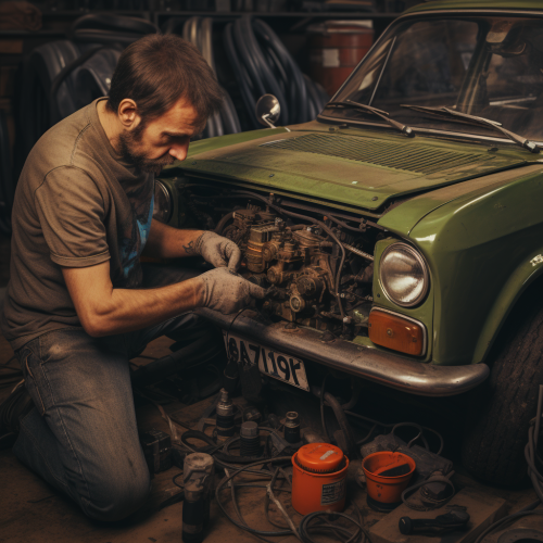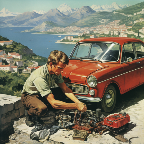 fixing the carburetor on the lada, on the side of an italian freeway, 1970's poster style