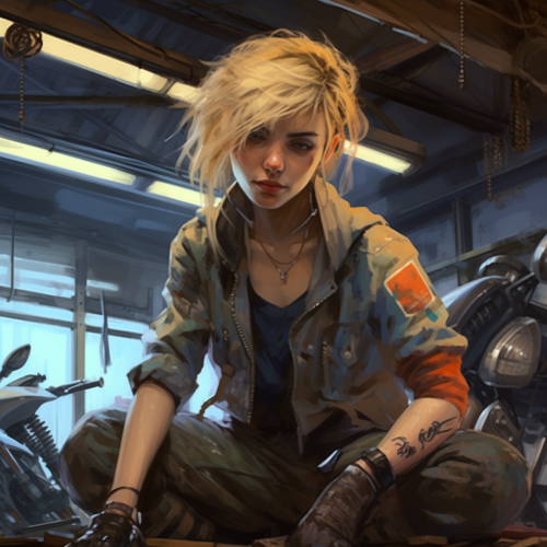full body, ilustration 18 aged woman, grease stains ,mechanic, with overalls, blonde, messy and short hair, fixing a futurist motorbike, cyberpunk style, mechanic background, indoors