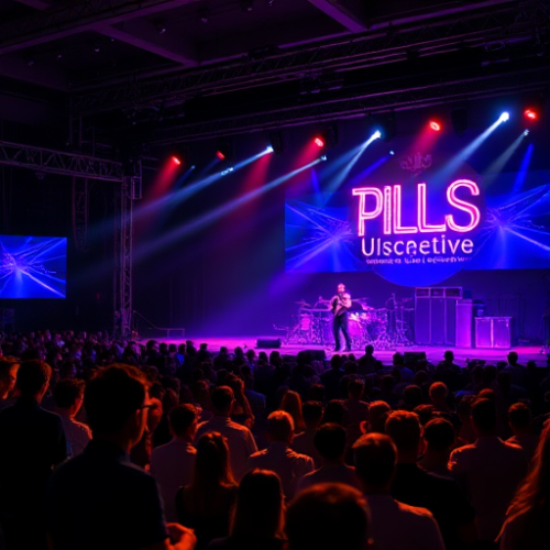 An illustration of a music concert scene with an empty stage, complete with lighting, speakers, and musical instruments set up. The crowd is in the foreground, without any performers on stage.