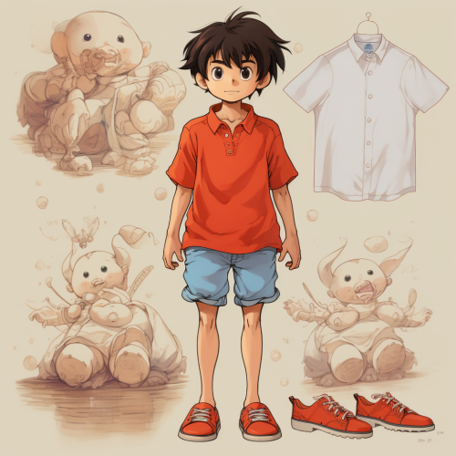 A character sheet of cute ganesha, red shoes, spaceshipt on shirt, multiple angles, studio ghibli animation, studio ghibli style