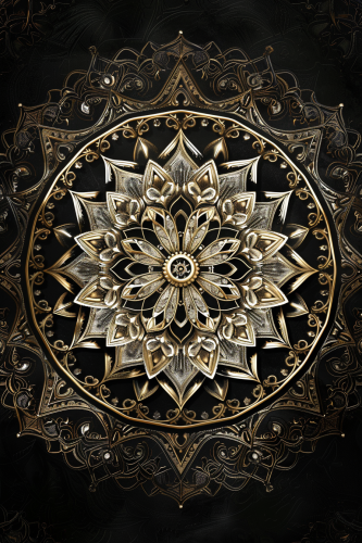 A detailed illustration on a black background, depicting an intricate mandala design in gold and silver metallic tones. The mandala is centered, with delicate patterns extending outward, creating a sense of depth and richness. Created Using: ornate design, metallic sheen, intricate detailing, sacred geometry, digital engraving, high-resolution finish, luxury aesthetics, hd quality, natural look --ar 2:3 --v 6.0