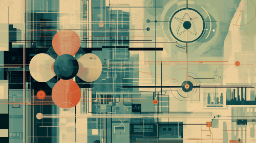 A 1950s atomic-age futurism scene with a pastel color palette of soft blues, grays, and light reds. Features abstract atomic models, radar-style concentric circles, and geometric shapes. Incorporate modern finance and technology symbols like data clouds and graphs. Blends vintage optimism with a clean, professional look, suggesting a balance of retro-futuristic design and contemporary financial technology. --v 6.1 --ar 16:9 --q 2