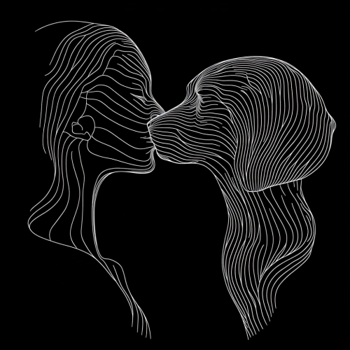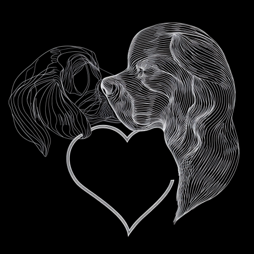 PROFILE CONTOURS OF THE FACE OF A WOMAN AND A BASET DOG FACING EACH OTHER AS IF IN A KISS, THE OUTER THICKER CONTOUR LINES FORM A HEART SHAPE. WHITE CLEAR LINES ON BLACK BACKGROUND