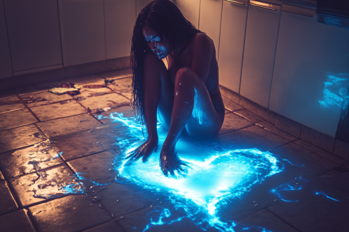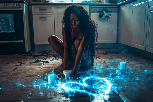 stunningly beautiful african woman with long hair sits crying streams of milk down her face on the tiled kitchen floor that has a giant heart shape on the floor and blue flames flicker around the edges of the image --ar 3:2