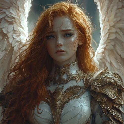 Heartbroken and depressed but determined Archangel general. She is about 30 years old. She has massive white wings, long red hair, and deep blue eyes with a soft glow. She looks like Eva Green. She is wearing elaborate golden Renaissance valkyrie armor. Epic. Dark Fantasy. Baroque style.
