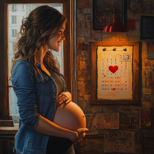 in the early down light, a beautiful young pregnant woman looking at a date circled with a heart in red color on the calender hanged on the wall. She is happily smiling and one of her hand is on her belly. Hyper realistic, warm colors