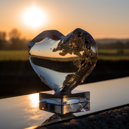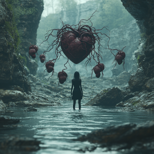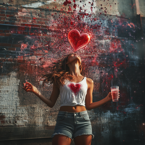 photorealistic image of a woman with her heart pouring out suddenly bursting with red and pink sparkles, liquids, hearts, mystical and love themed, backround urban city los angeles santa monica