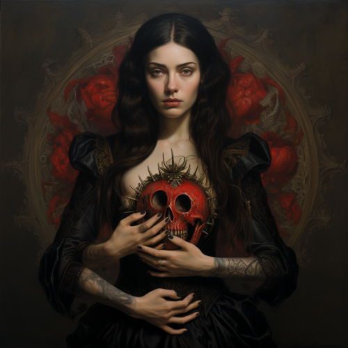 Jan van Eyck style oil painting of a gothic beautiful tattooed brunette woman holding the sacred heart, with gothic victorian background