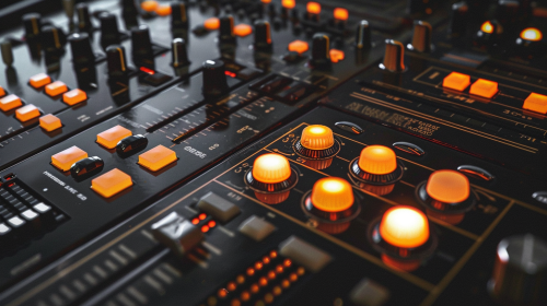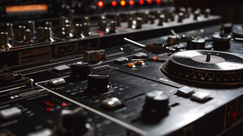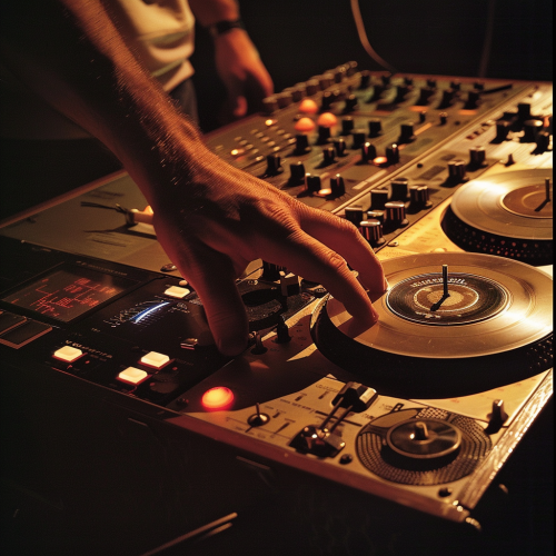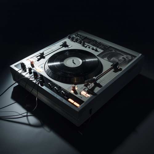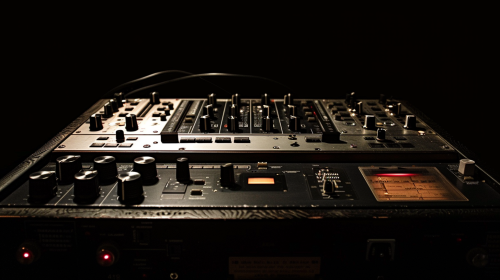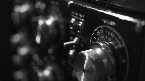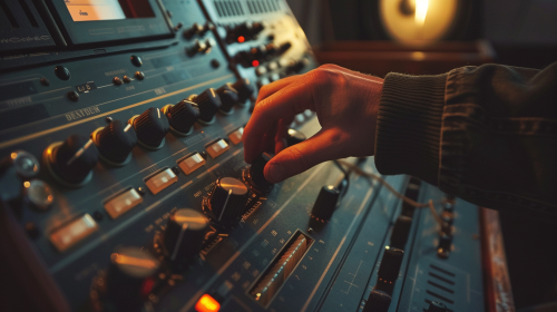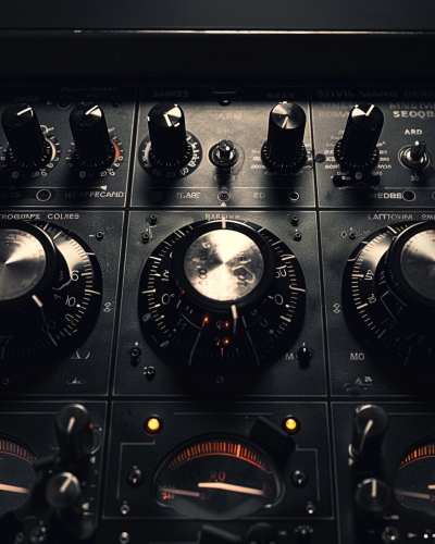 Eine Hand, die einen Regler an einer 70er-Jahre Drummaschine bedient. Die Maschine ist zentral und freistehend auf einem tiefschwarzen Hintergrund positioniert, mit hochwertigen Drehreglern, einem VU-Meter und leuchtenden Röhren. Das Bild ist in Schwarz-Weiß gehalten, mit der Hand im Fokus, während die Röhren in warmem Licht glühen. Professionell und seriös, hd-Qualität --ar 1:1 --v 6.0 --style raw