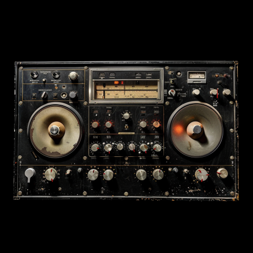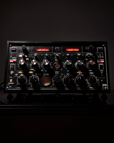 Eine 70er-Jahre Drummaschine, die freistehend auf einem tiefschwarzen Hintergrund zentriert ist. Die Maschine verfügt über hochwertige Drehregler, ein VU-Meter und leuchtende Röhren. Das Bild ist in Schwarz-Weiß gehalten, die Röhren strahlen in einem warmen, sanften Licht, was die Detailtreue und die handwerkliche Qualität der Hardware betont. Professionell, seriös und extrem detailreich --ar 16:9 --v 6.0 --style raw