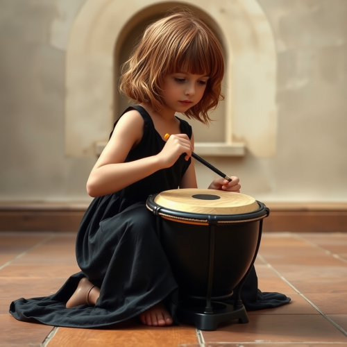 a old men cross-legged play with his hand on a metal drum kit transportable that you can put on the knee. with main drum on the top. the structure is a round like an metal handpan. On the instrument there are handpan notes, small drums