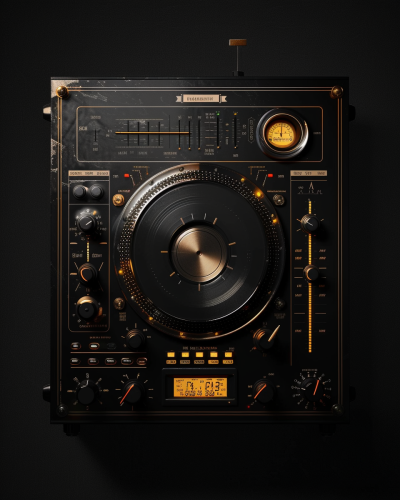 Eine vintage Drummaschine im Stil eines 70er-Jahre Kompressors, freistehend in der Mitte eines tiefschwarzen Hintergrunds. Die Maschine ist in Schwarz-Weiß gehalten, mit präzisen Drehreglern, einem VU-Meter und Röhren, die in warmem Licht erstrahlen. Das Bild strahlt Seriosität und Professionalität aus, extrem detailreich, hd-Qualität --ar 4:5 --v 6.0 --style raw