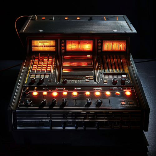 Eine retro-analoge Drummaschine aus den 70ern, zentriert und freistehend vor einem tiefschwarzen Hintergrund. Die Maschine ist in Schwarz-Weiß gehalten, mit leuchtenden Röhren, die in warmem Licht glühen. Hochwertige Drehregler und ein VU-Meter sind präzise dargestellt, und das Bild strahlt eine seriöse, professionelle Atmosphäre aus, hd-Qualität --ar 1:1 --v 6.0 --style raw