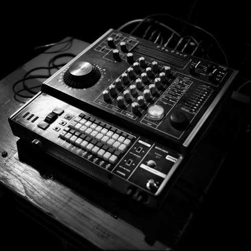 Eine vintage analoge Drummaschine aus den 70ern, freistehend in der Mitte eines tiefschwarzen Hintergrunds. Das Bild ist in Schwarz-Weiß gehalten, mit hochwertigen Drehreglern, einem VU-Meter und leuchtenden Röhren, die das einzige farbige Element im Bild sind. Extrem professionell, minimalistisch und sehr detailreich --ar 1:1 --v 6.0 --style raw
