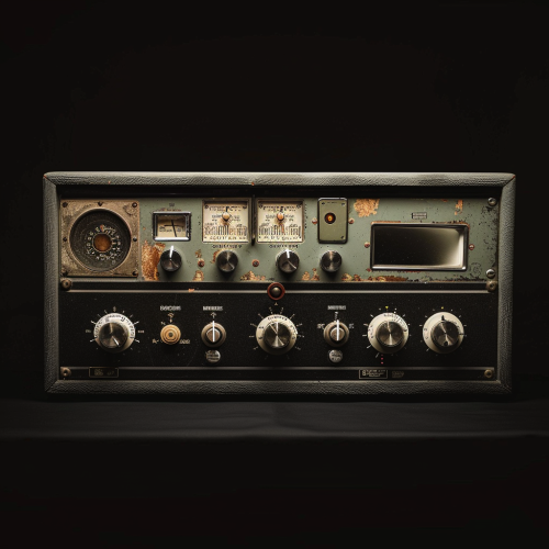 Eine analoge Drummaschine aus den 70ern, nachempfunden einem Kompressor, freistehend auf einem tiefschwarzen Hintergrund. Das Bild ist in Schwarz-Weiß gehalten, mit hochwertigen Drehreglern, einem VU-Meter und leuchtenden Röhren, die in warmem Licht erstrahlen. Extrem professionell und seriös, mit starkem Fokus auf die Hardware, hd-Qualität --ar 16:9 --v 6.0 --style raw