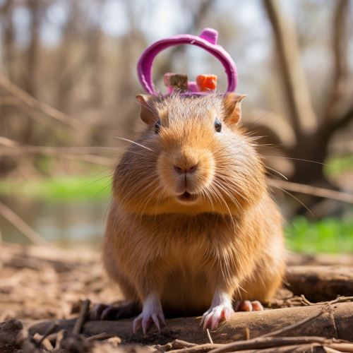 a golden labrador retriever dressed as easter bunny rabbit in style of fabric doll, wool, warm spring colors, miniature display, front view --ar 3:4 --stylize 250 --niji 6
