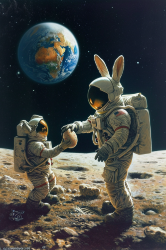 Easter bunny in a spacesuit on the moon giving a other astronaut a easter egg, earth in the backround --ar 2:3