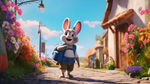 little Lapin de Paque standing outside his front door, a backpack slung over one shoulder. - Capture the vibrant colors of flowers, lush grass, and a clear blue sky in the background. --ar 16:9