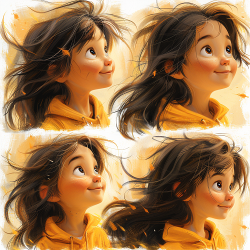 A six-panel collage for Children's book illustration. using Line art illustration using flat colors of a very happy 6-year old girl, with wavy dark brown hair and brown eyes, wearing simple clothes. High-quality children's book illustration for a great children's story, on a plain white background. she is moving, turning, and getting slightly happier in each frame. Closeup illustration.::3 Thick outlines with beautiful detail::-1 Evenly-spaced illustration grid with bold, flat colors, vibrant colors in the style of Lilia Alvarado and Jasmine Becket-Griffith. --v 6.0 --s 750