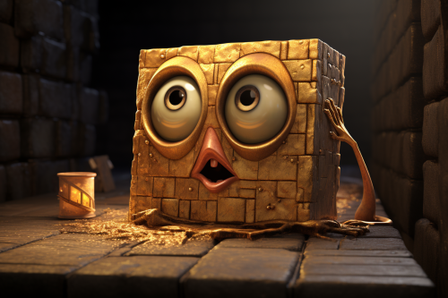 a story book character. A medium sized gold brick with eyes and mouth on a blacksmith's table::3 Midevil fairytale setting. cute. adorable. hero. Wide shot. story book style. children's book style. zbrush. hyperrealistic. surreal. beautiful art. warm colors. warm lighting. studio lighting. --ar 3:2