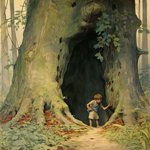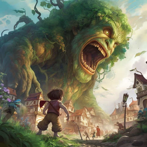 a giant hiding in the woods, beanstalk, fairytale illustration, colorful, children's book, 1700s
