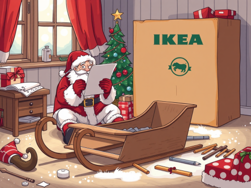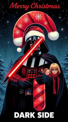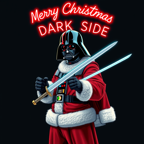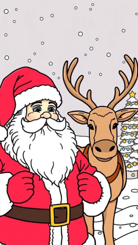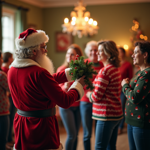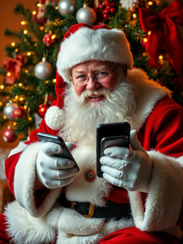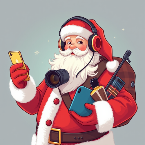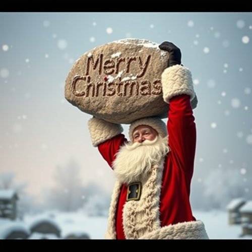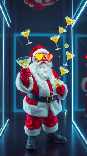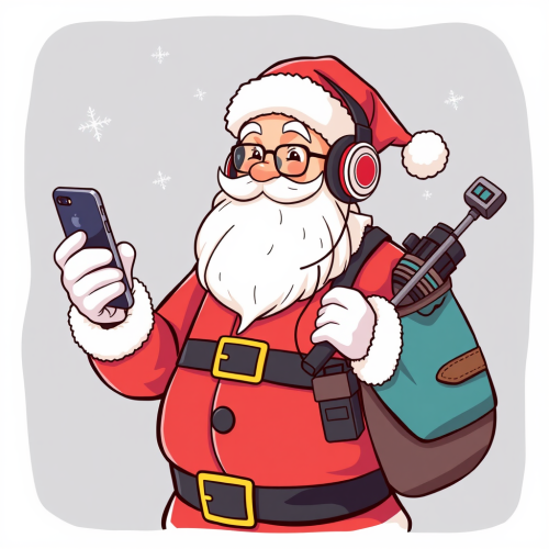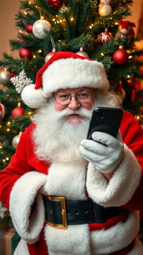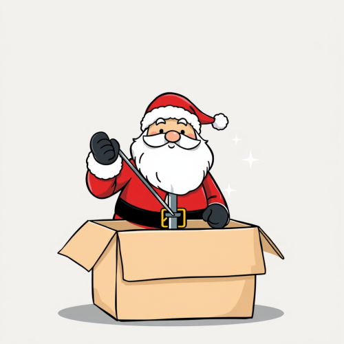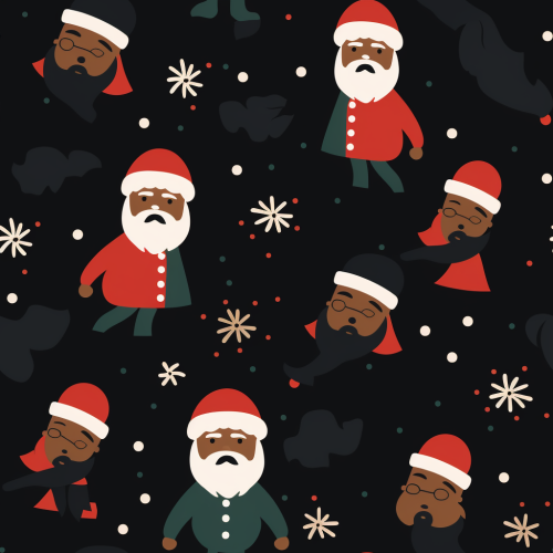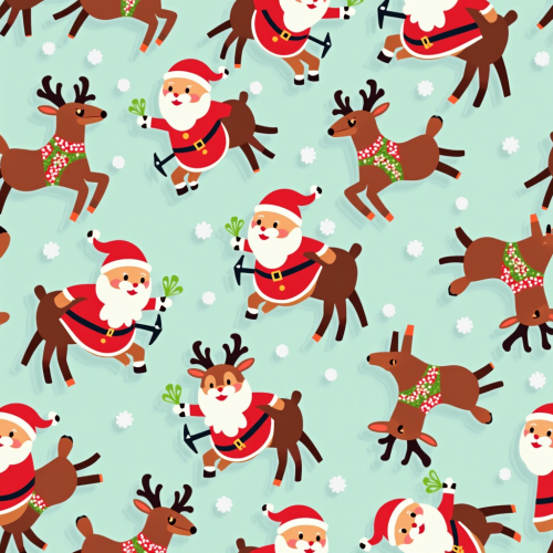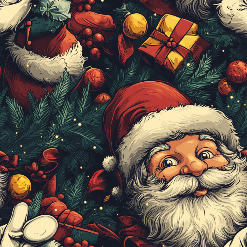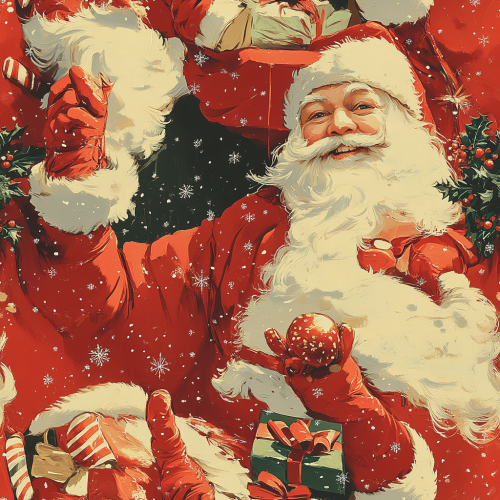 A festive Christmas wrapping paper design featuring Santa Claus with a subtle, cheeky twist. Santa is wearing his classic red suit and hat, holding a gift with one hand and a raised hand that appears almost as a wave but shows a discreet middle finger gesture, hidden partially by his red glove. The design includes traditional Christmas elements like holly, snowflakes, and candy canes, arranged in a playful, repeating pattern. The overall tone is humorous but lighthearted, creating a slightly edgy, unexpected holiday vibe without being too overt, --tile --v 6.1 --s 750