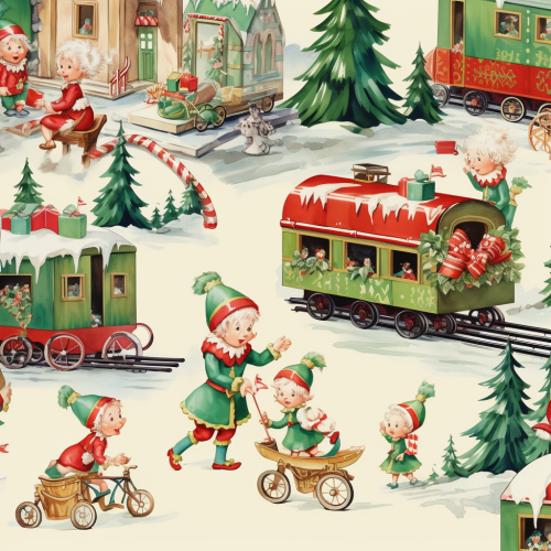 cartoon anime Christmas elves playing with little mini toy trains. Wrapping paper full background. Vintage