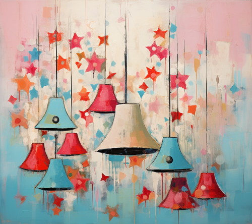 a painting of Christmas Bells, in the style of playful and whimsical designs, xmaspunk, pop art-inspired compositions, pink and cyan, erica hopper, american mid-century design, the stars art group (xing xing) --ar 9:8