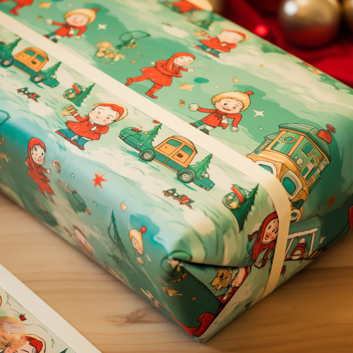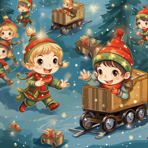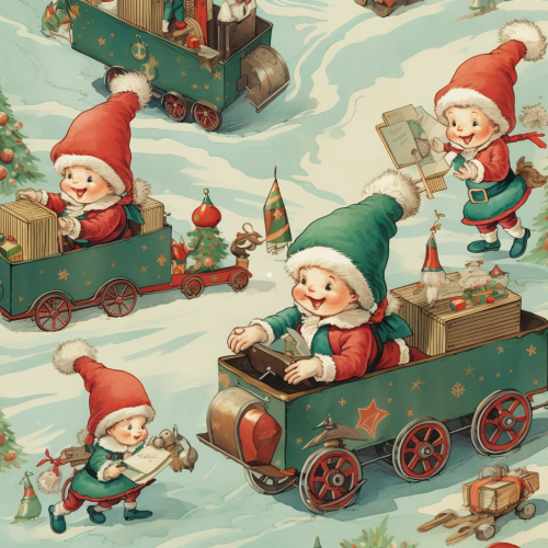 cartoon anime Christmas elves playing with little toy trains. Wrapping paper full. Vintage