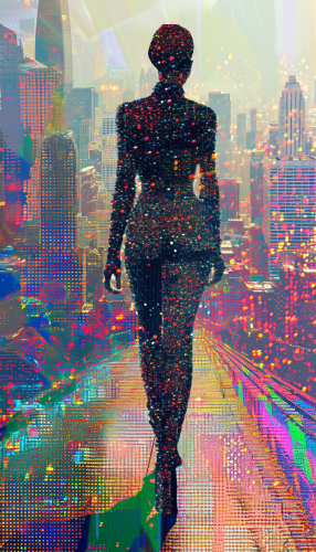 Full-face, full-length female image in the style of high Italian fashion against the backdrop of the city of the future. beautiful tactile volumes. the art of pointillism dominates the creation of the work. wide color gamut, direct light, sharp edge, high contrast, high quality, wide viewing angle, zoom, full height, sharp edge, high contrast, high quality --ar 4:7 --v 6.0