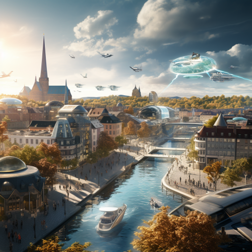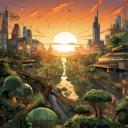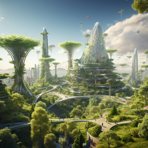 Green city of the future. City of the future. Harmony of city and nature and AI. Sunny day in the big city. --ar 3:1 --v 5.1 --style raw