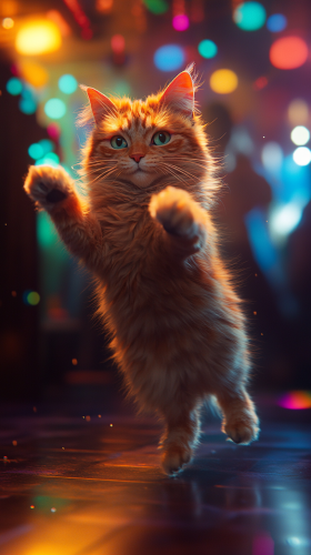 3D Pixar-style animation, volumetric lighting, subsurface scattering, physically based rendering, cinematic composition, 32k textures, hyperrealistic fur simulation:: orange tabby cat mid-leap, fur flowing dynamically, determined expression, swirling vortex of colorful light around him, vibrant retro 80s disco filled with dancing cats, dramatic side lighting, dynamic Dutch angle, excitement and wonder in the atmosphere --ar 9:16