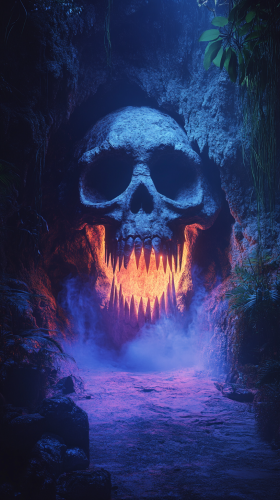 Hyperrealistic dark cave skull shape entrance like a open mouth with sharp teeth in a very spooky misty scary jungle at night. colourful Disco lights coming out out of the cave entrance --ar 9:16 --v 6.1