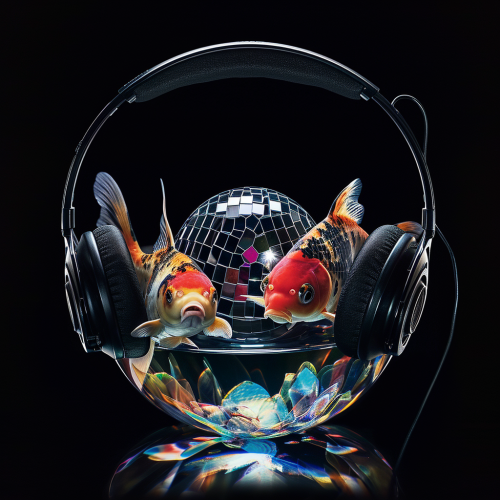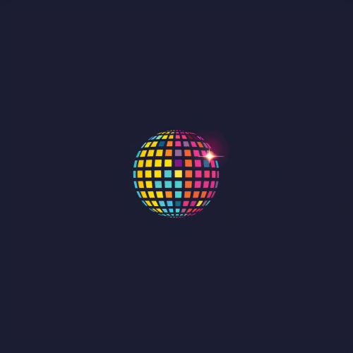 very colorful concert scene with an atmospheric vibe. In the center above the crowd, there's a large, reflective disco ball. Circling the disco ball is a ring of bright white light, giving the appearance that it's spinning. The crowd beneath is in silhouette, their hands raised in excitement. The background is dark to highlight the luminosity of the disco ball and the light ring. The setting suggests a night of vibrant music and dance. The image should be full of energy, color and movement, capturing the essence of a live music event