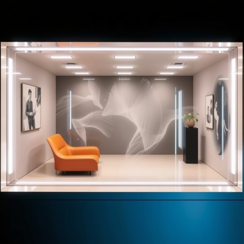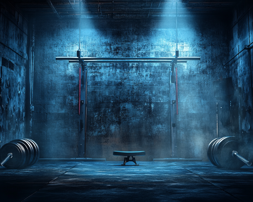 a very cool studio background image to be made into a big display. the feeling is moody but positive. the show is about weightlifting, strength, nutrition. be creative and make the colors grays, blues, reds. use spotlighting. show exercise but no people. make it very high resolution. photo quality. --ar 5:4 --v 6.1