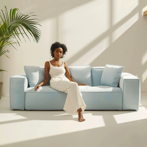 extra large and long baby blue color 4 seater sofa, modern, fabric, stiff soft seating, modular base, white background studio shoot with cool light product shoot of sofa, mixed race woman sitting on the sofa wearing beautiful white clothing, short straight black hair, real looking, soft features and minimal jewelry and makeup, product shoot, studio shoot, full view of sofa, soft , sunshine coming through window shadow, plant behind sofa, minimal --v 6.0