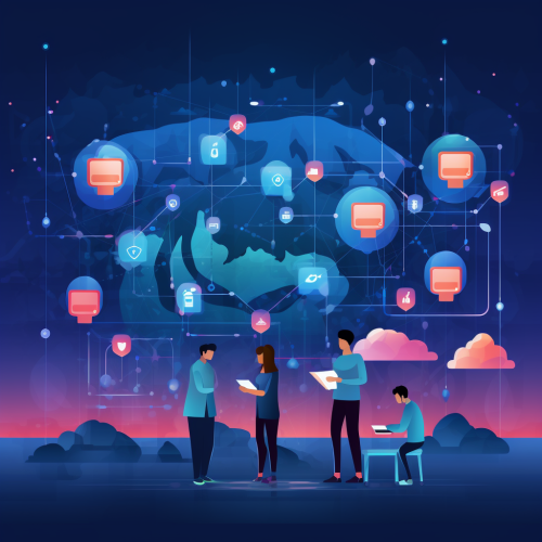 a background banner website image that illustrates happy peoples using blockchain technology and web3 in a digital universe for real use cases, webdesign, vector, flat design, 4H, HD