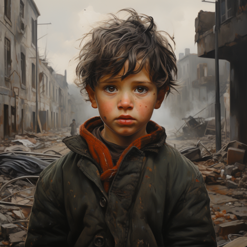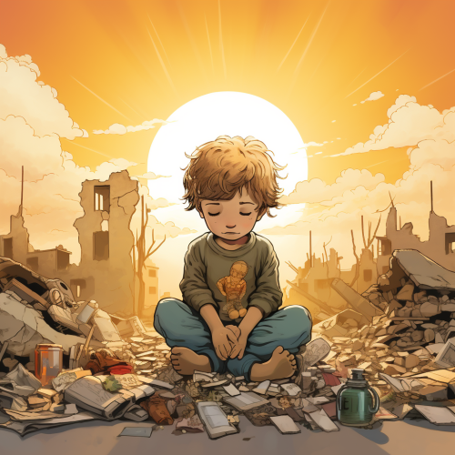 illustration in real style of a crying three-year-old Palestinian boy who is sitting on the ruins of his bombed-out house in the form of a profile, sad, holding his hands to the sky and praying. Below his feet are some toys, dolls and cars. A beautiful sun shines in the sky