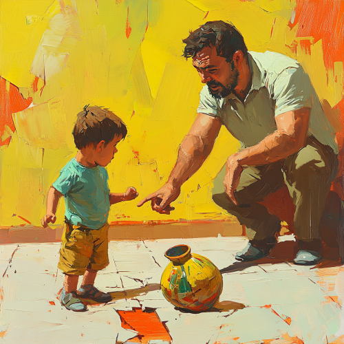 a bright and colourful cartoon painting of a cute little romanian boy looking at his dad with remorse, pointing to a broken vase on the floor. The image should be colourful and bright